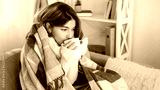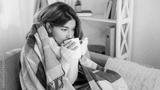 Tea warm. Rest drinking. Autumn shivering. Cold brunette woman in blanket enjoying hot beverage feeling frozen sitting on couch in light home interior.