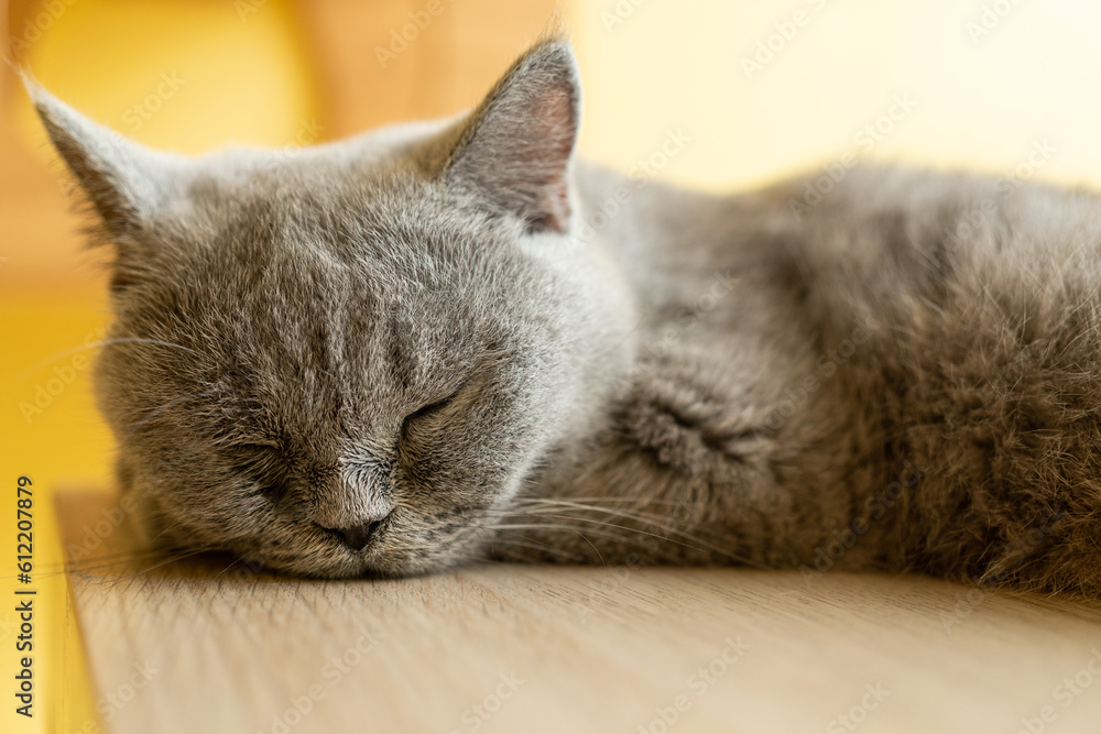 Dark Gray Cat sleeping on a wooden table. sleeping cat