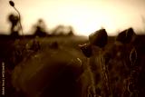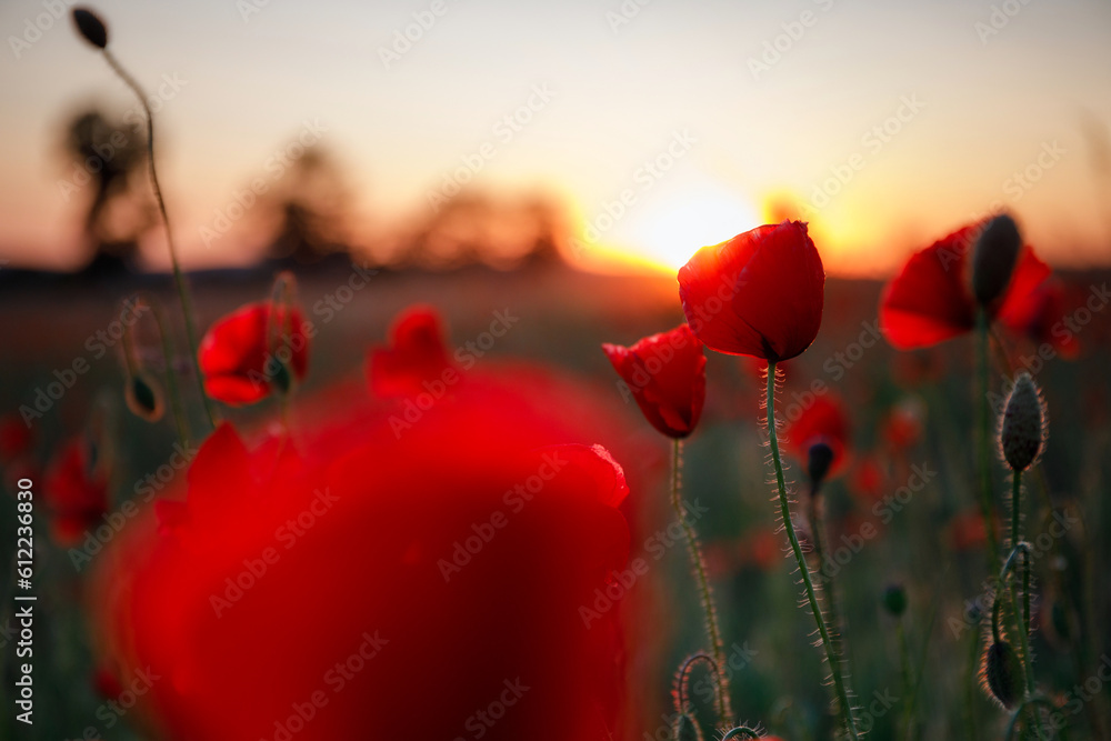 Beautiful meadow with the poppy flowers at sunset, Poland.