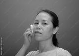 Middle-aged Asian women aged around 40-50 years old with aging skin. Soak a cotton ball in facial treatment to remove makeup. Facial skin has wrinkles and dark spots.