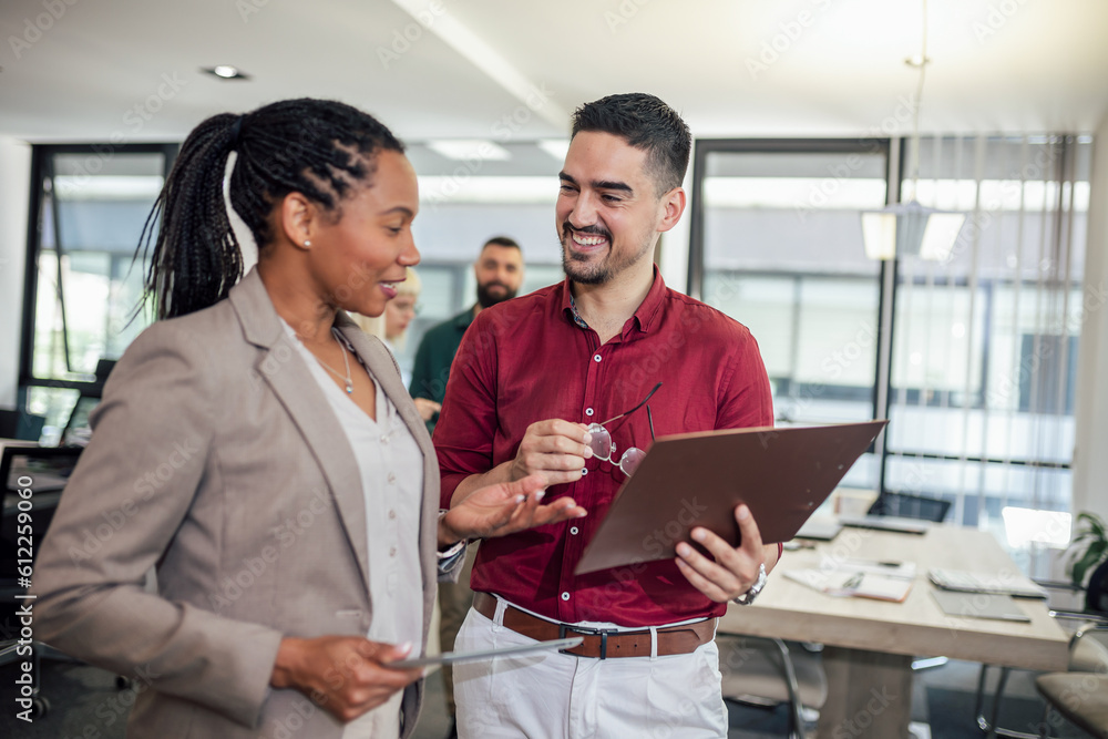 A business team is standing in a modern office and having a discussion