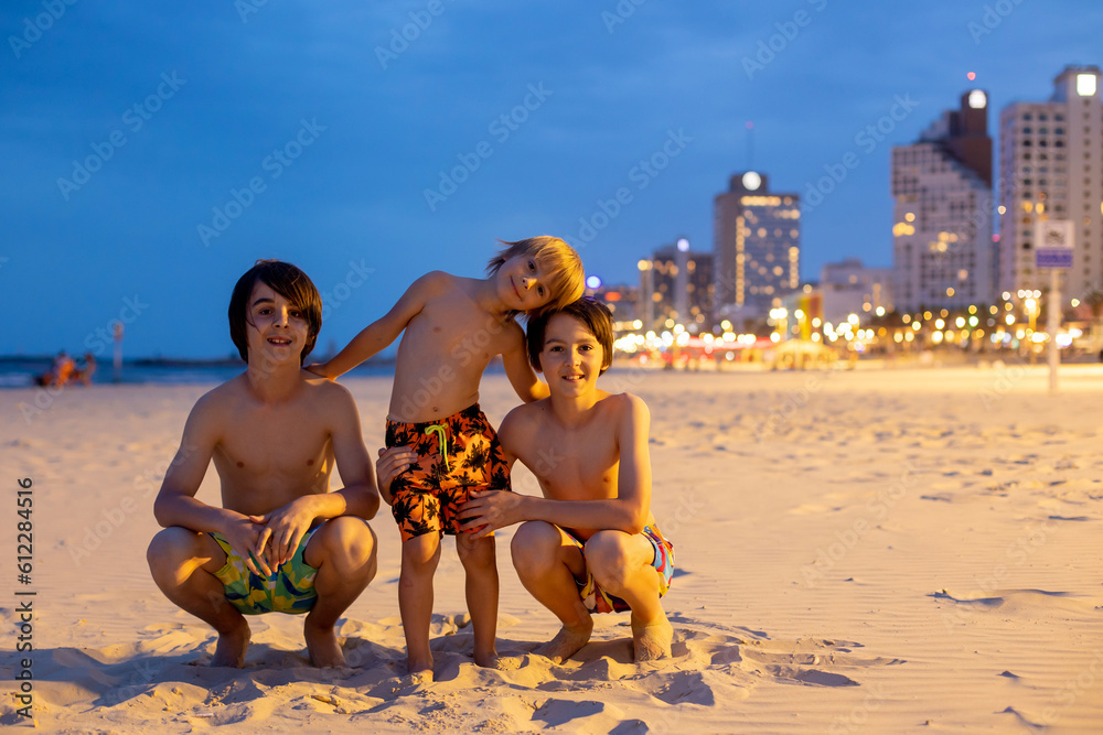 Child, boy, playing on the beach in Tel Aviv in the evening