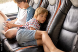 Child, cute blond boy, sleeping in the bus on a way back from holiday, older brother playing on the phone