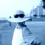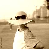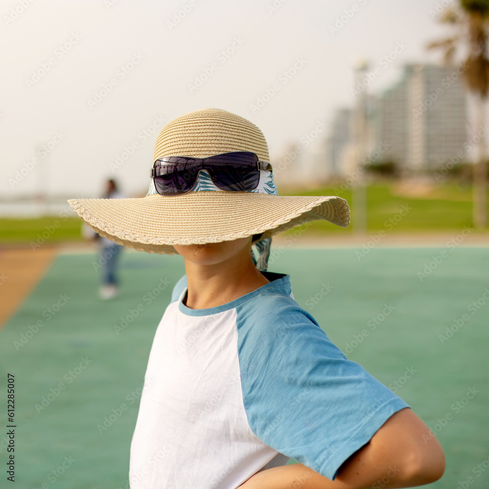 Cute child with straw hat, enjoying the seaside views in Tel Aviv on a hot summer day