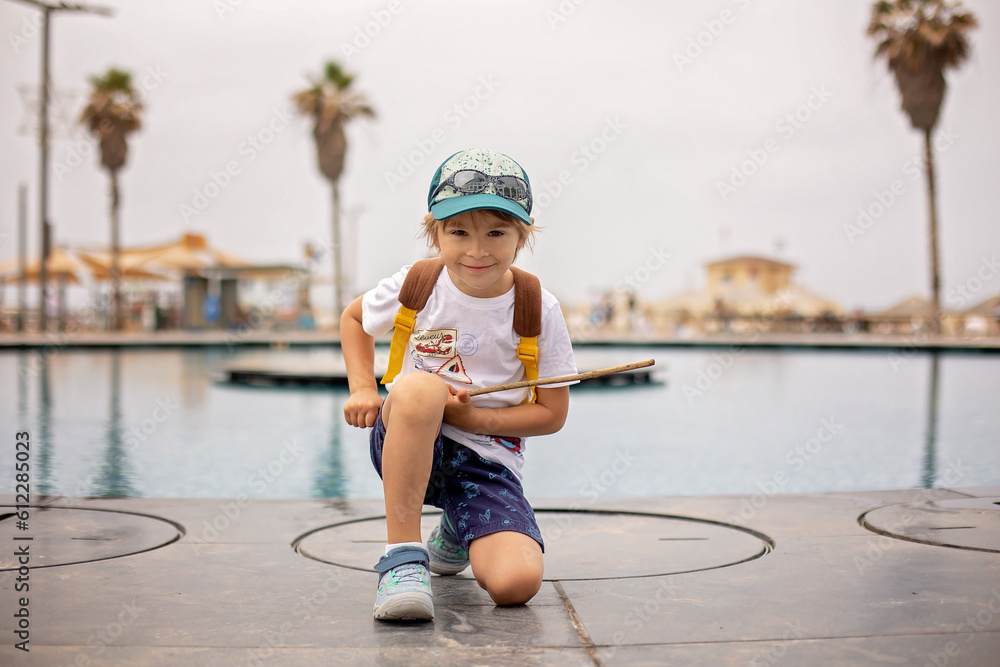 Cute child, boy, playing with water in fountain in Tel Aviv