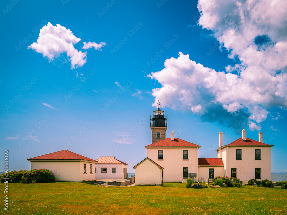 Beavertail Lighthouse in Jamestown, Rhode Island, dramatic white cloudscape on the blue sky over the green meadow park