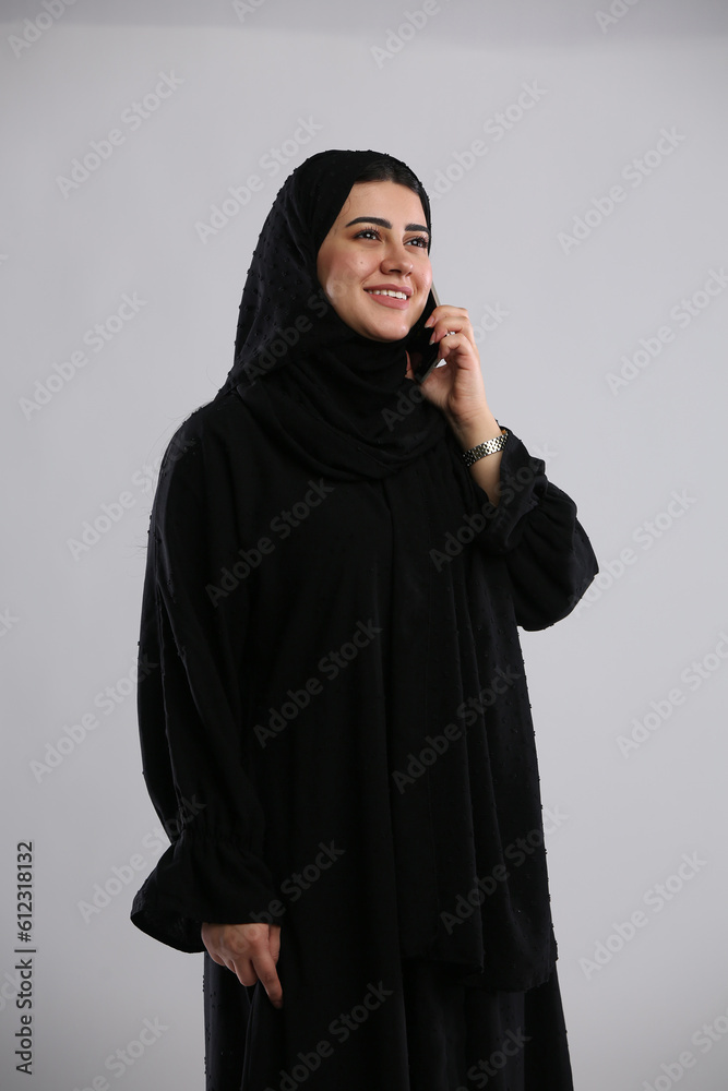 saudi arabian woman in hijaab standing with phone in hand and talking with a smile