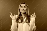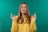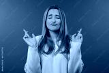 Pretty woman praying with crossed fingers on blue background. Satisfy desires