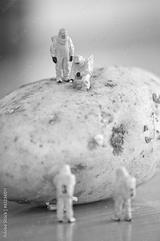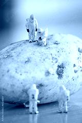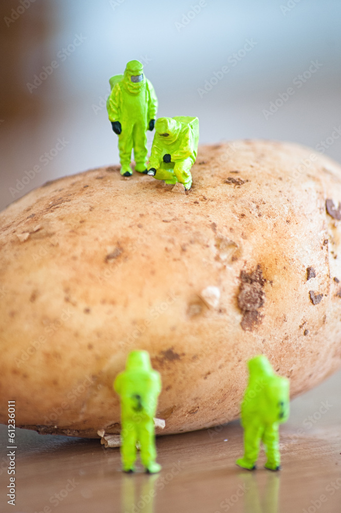 Group of Researchers in protective suit inspecting a potato.
