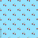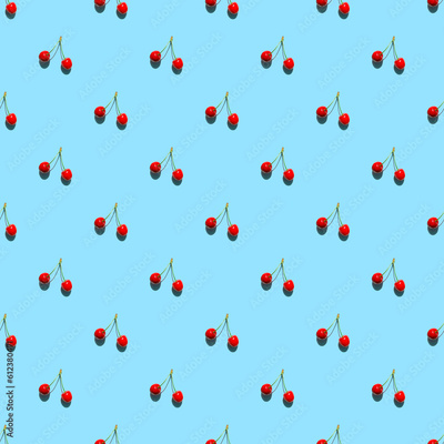 Cherries on blue background with shadows. Seamless pattern