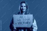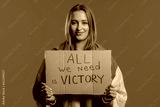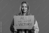 Ukrainian woman with cardboard All we need is victory on blue background.