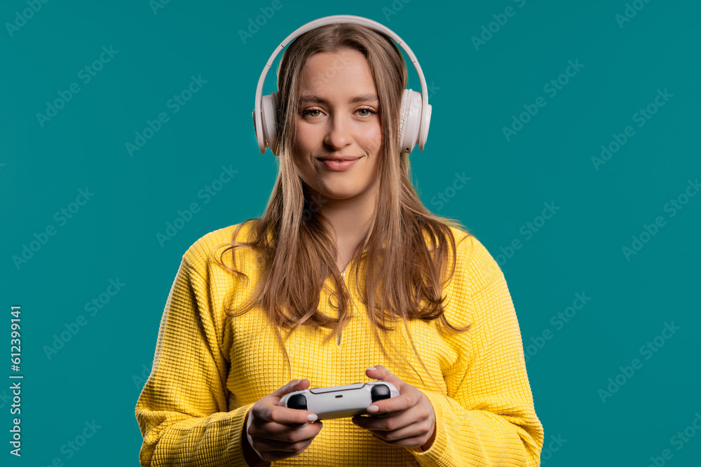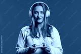 Young woman playing online video game, console TV with joystick on blue backdrop