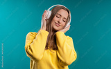 Positive blonde woman listening music, enjoying headphones on blue background.