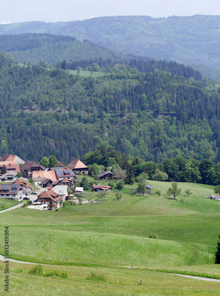 Fröhnd im Wiesental . Im Herzen des Naturparks Südschwarzwald. Blick ins Tal und Orsteil Hof umgeben von grünen Wiesen