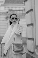 Fashionable elegant confident woman wearing trendy pink sunglasses, suit blazer, white silk scarf, trousers, with green faux leather shoulder bag, posing in street. Outdoor fashion portrait