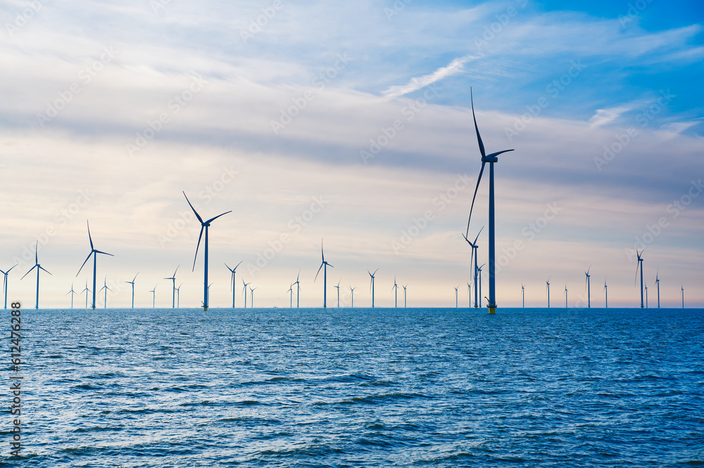 Offshore Windmill farm. windmills isolated at sea on a beautiful bright day Netherlands. green energy Flevoland global warming renewable enrgy with windmills