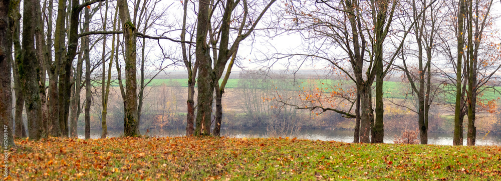 Autumn landscape with trees by the river, panorama