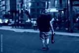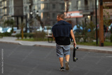 Back view young man walking down the street with skateboard in his hands. Close up portrait of a young male carrying his longboard down the street.