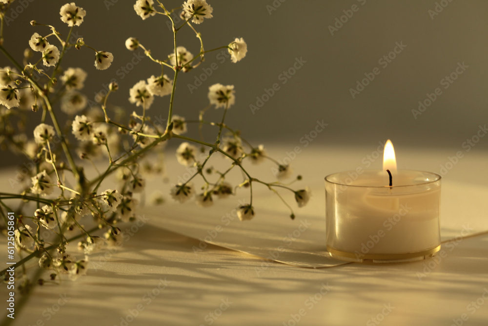 Burning candle and flower twig. Soft focus. Evening Light and shadow background. Minimalist still life.