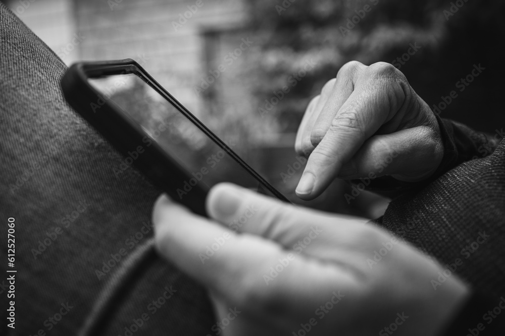 Close-up of person checking smartphone sitting on outdoor bench in a casual jean. Travel, connecting, relaxing, working, online, e-work, remort work concepts. Black and white retro photo.