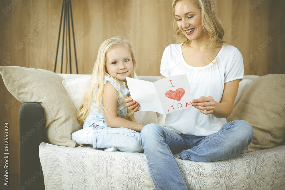 Happy mother day. Child daughter congratulates mom and gives her postcard with heart drawing. Family and childhood concepts.