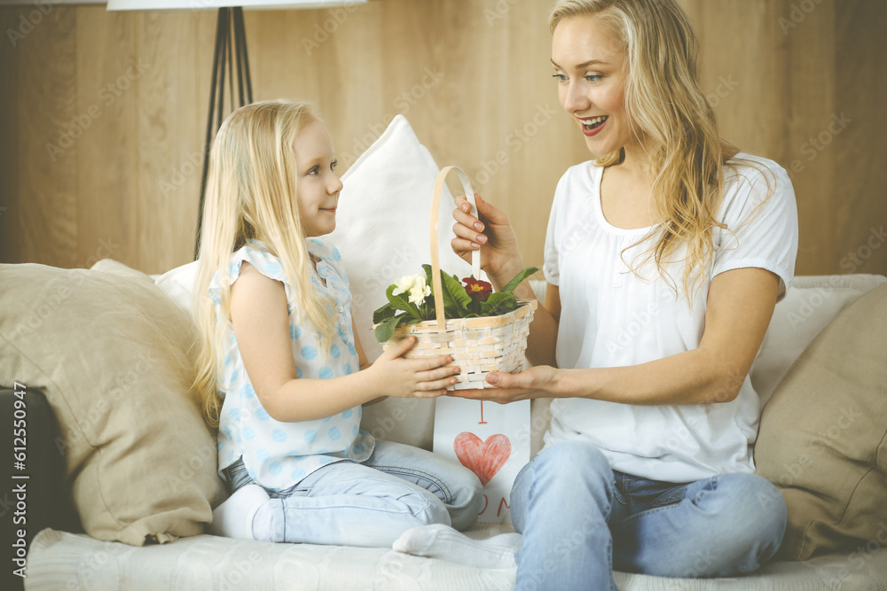 Happy mother day. Child daughter congratulates mom and gives her basket of spring flowers and postcard with heart drawing. Family and childhood concepts.