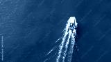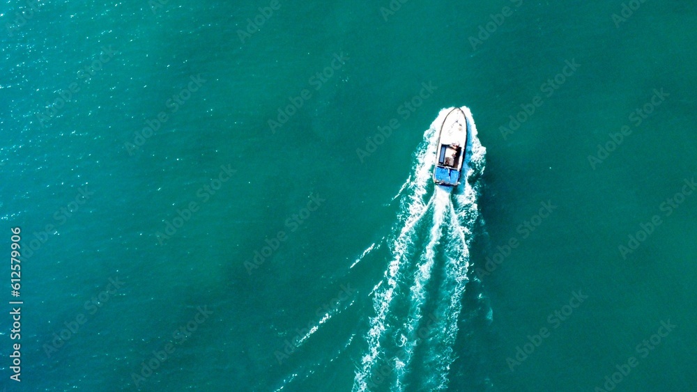 Aerial view of the ship driving on the blue sea with copy space