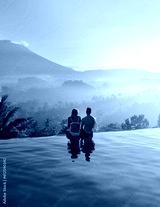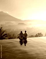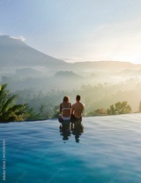 Couple watching charming mountain views from a water pool villa, Indonesia