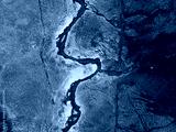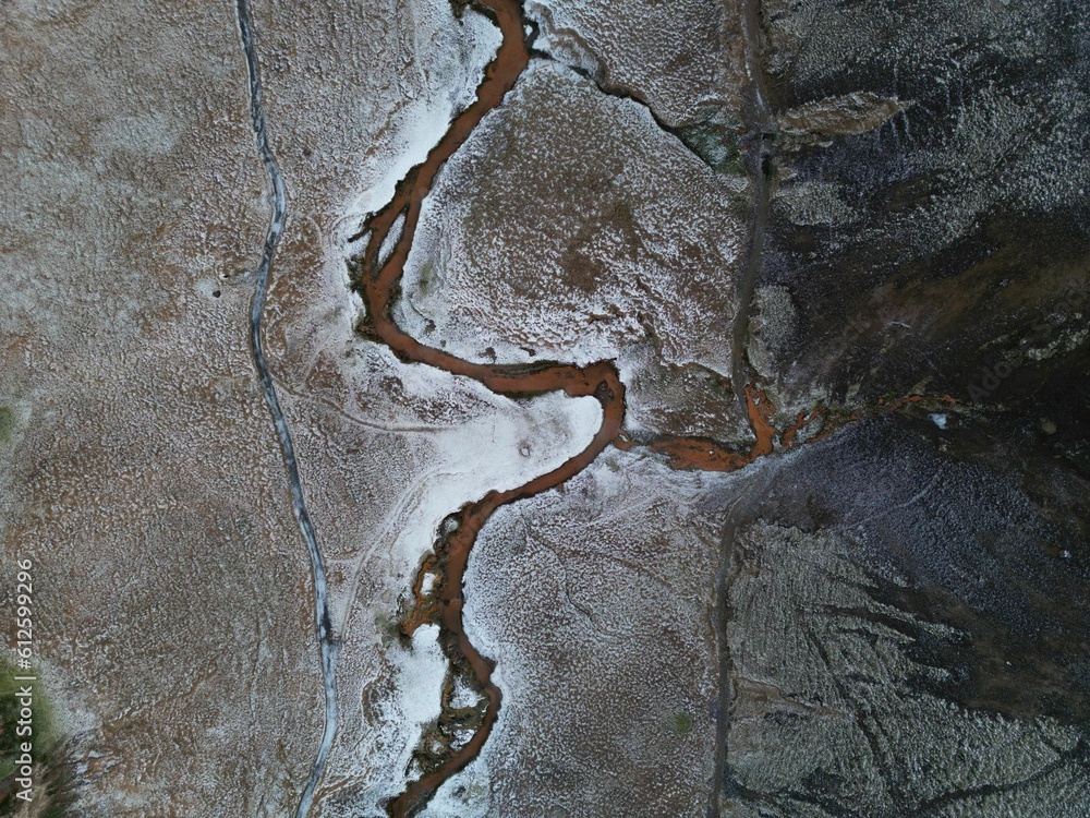 Aerial view of a river in the snowy valley. Reykjadalur, Iceland.