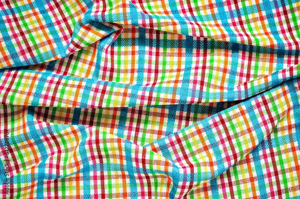 Wrinkled texture material rag. Colorful fabric background checkered.