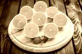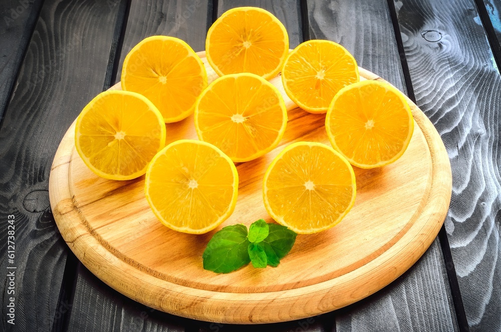 Lemons on a black wooden table. Lemon halves on a chopping board.