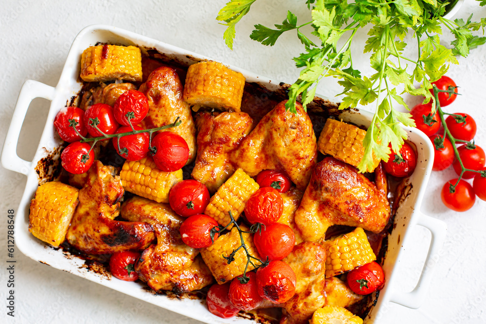 Oven baked chicken wings with homemade tomato or bbq sauce, corn cobs and cherry tomatoes.