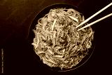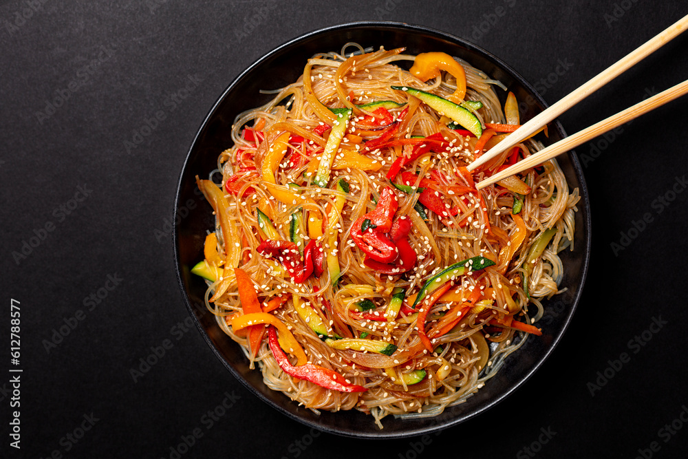 Top view of a plate with Japchae , Korean glass noodle made with sweet potato starch, stir fried with vegetables. Zucchini, bell pepper, carrot, sesame seed.