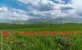 Bright flowering poppy fields in the mountains.Red poppies of memory.