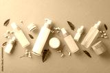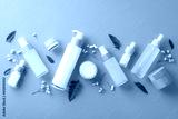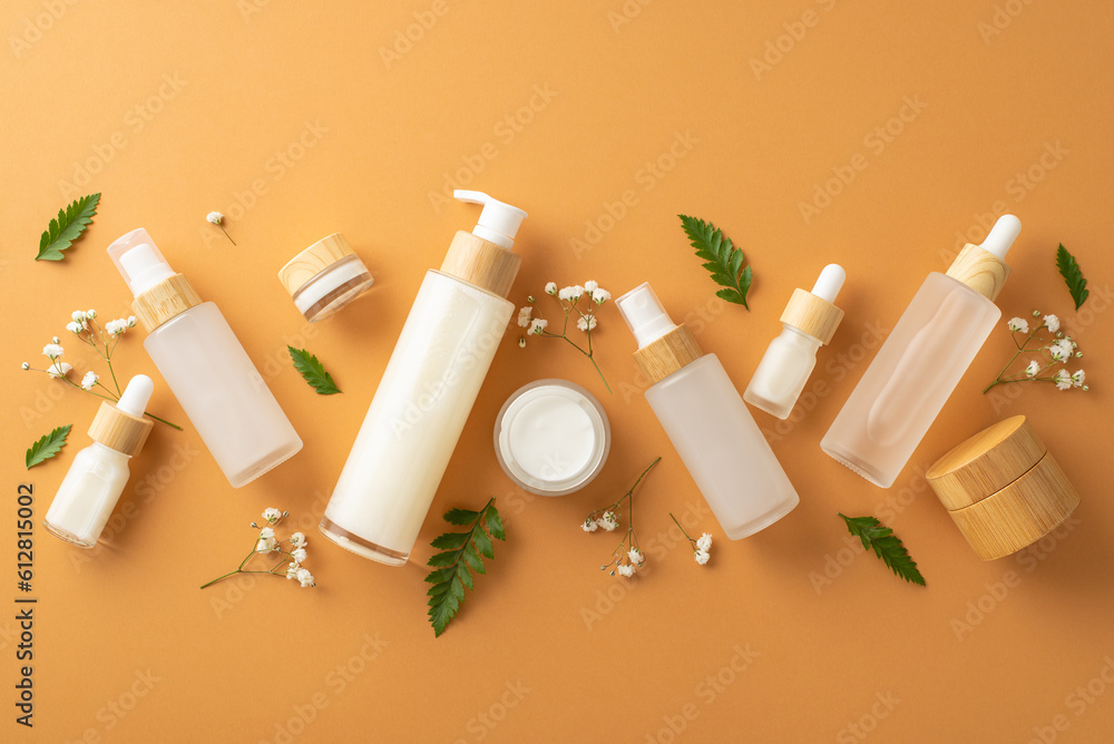 Organic cosmetic products concept. Top view photo of cosmetic jars, bottles and tubes, fern leaves and white gypsophila flowers on isolated beige background with copyspace