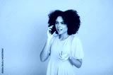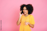 Phone talk. Confused successful busy mixed race curly haired woman, talking on mobile phone with friend or colleague, looking away, gesturing with hand, standing on isolated pink background
