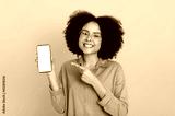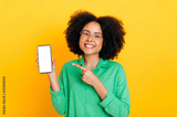 Happy african american or brazilian woman with glasses, holds smartphone with blank white mockup screen for presentation or advertising, points finger at it, smile at camera,isolated yellow background