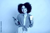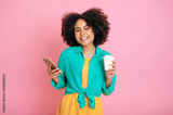 Trendy lovely stylish brazilian or hispanic woman, use her smartphone, messaging in social media, shopping online, order delivery, holds a cup of coffee, smiles at camera, isolated pink background