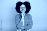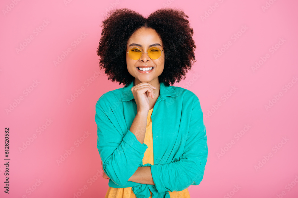 Positive gorgeous trendy brazilian or african american young woman with curly hair, dressed in stylish wear, looking at camera in a good mood, smiling friendly, standing over isolated pink background