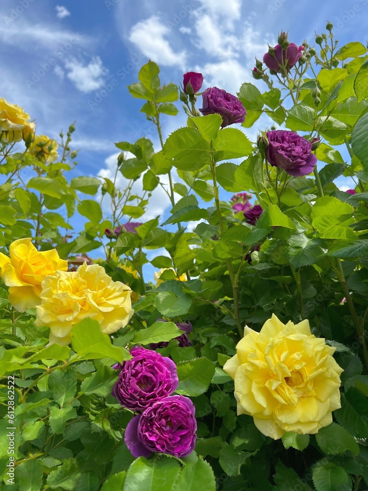 Roses flowers yellow purple floribunda bush in the rose garden.