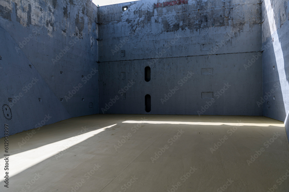 Empty hold on dry cargo vessel. Cargo hold on coaster ship. Commercial shipping. Cargo delivery.