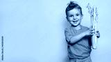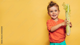 Caucasian little happy boy holds a fresh raw celery stalk on a yellow background. Space for text. Healthy lifestyle, diet concept, vegetarianism, raw food.