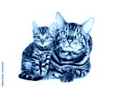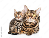 Adult bengal cat and tiny kitten lying together and looking at camera. isolated on white background