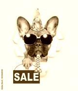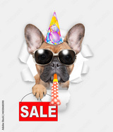 French bulldog puppy wearing sunglasses and party cap looks through the hole in white paper, blows in party horn and shows signboard with labeled "sale"