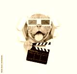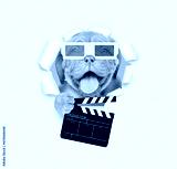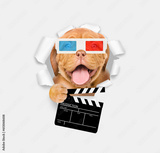 Happy puppy wearing 3d glasses looking through the hole in white paper and holding clapper board for making video cinema