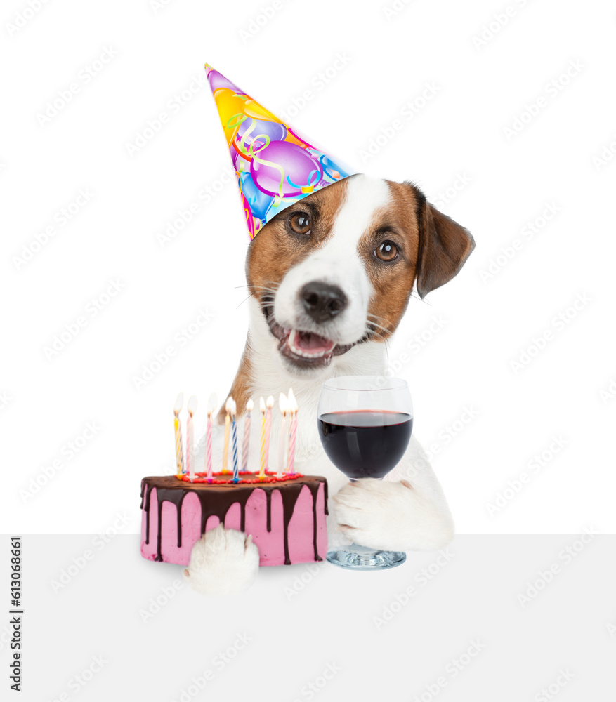 Jack russell terrier puppy wearing a party hat holds birthday cake with lot of candle and glass of red wine above empty white board. isolated on white background