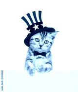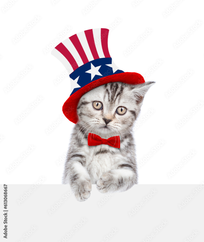 Cute kitten wearing like Uncle Sam looks above empty white banner. isolated on white background