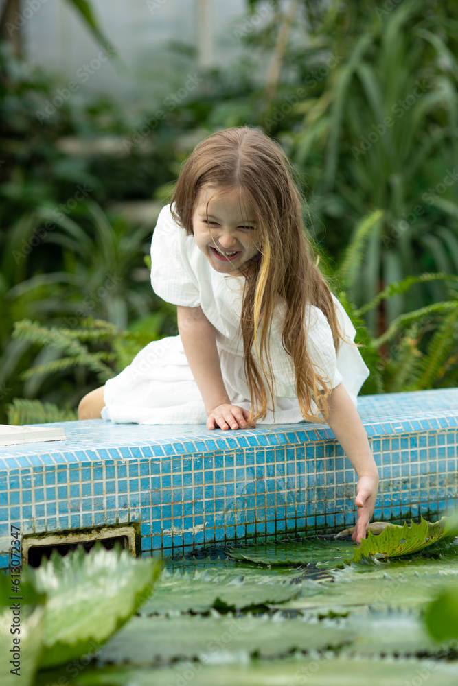 Cute little girl is lying on the side of a pool with water plants in the greenhouse of the botanical garden surrounded by tropical leaves. High quality photo