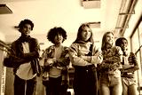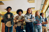 Group of happy teenagers standing with their arms crossed at high school and looking away.