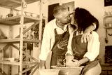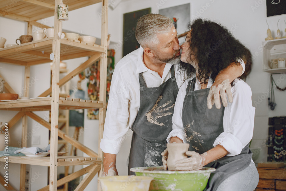 Adult senior couple at artwork in pottery